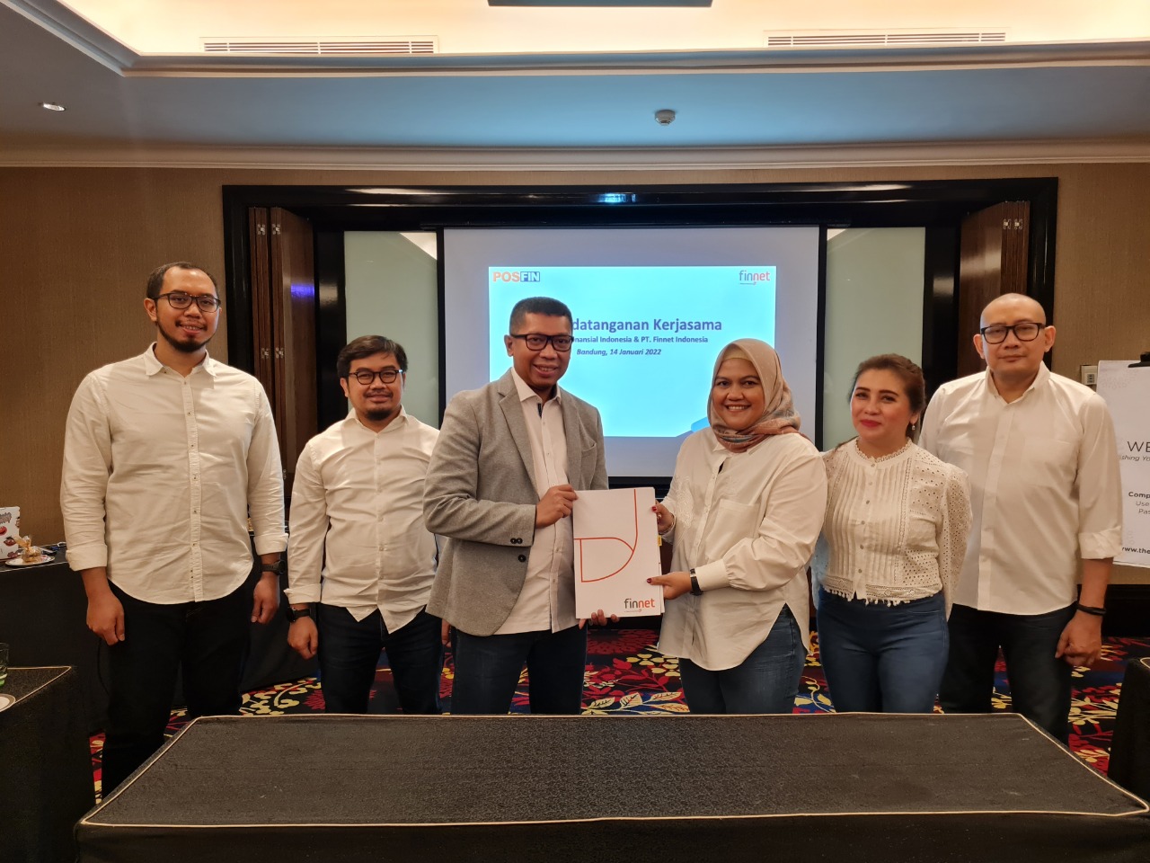 KERJASAMA (Kiri-Kanan): Chief Marketing Officer POSFIN, Riano Bayu Satria, Chief Operating Officer POSFIN, Sandi Mardiansyah, Chief Executive Officer POSFIN, Setyo Budianto, Direktur Business & Marketing Finnet, Irena Aldanituti, GHO Trading & E-Commerce Services Finnet Angelika Tiara Putri, dan Vice President Financial & Trading Services Finnet Firmanto A. Purawan usai Penandatanganan Perjanjian Kerjasama di Bandung (14/1/2022). ISTIMEWA
