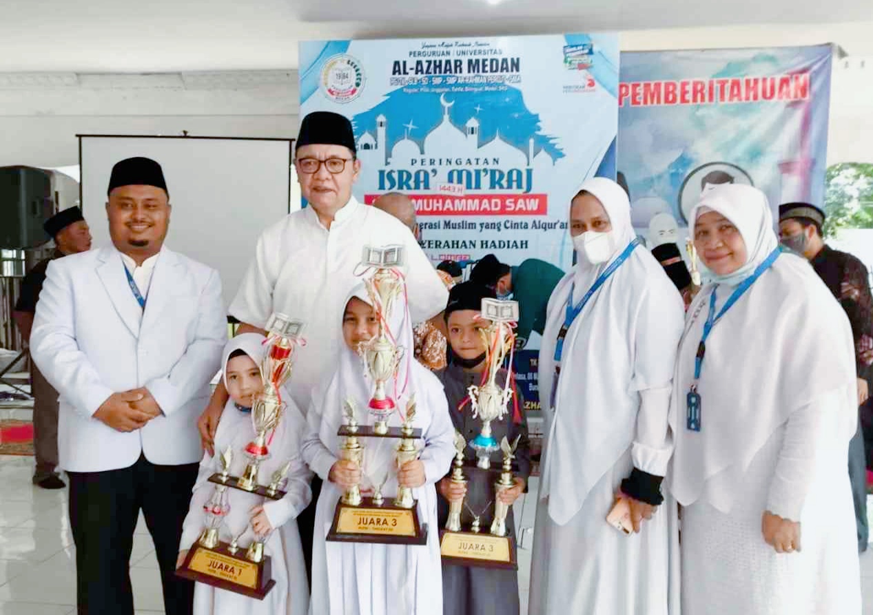 “Saya mengucapkan selamat kepada SD Al-Azhar Medan yang telah berhasil menggondol juara Lomba Tahfiz untuk jenjang SD. Semoga dengan raihan juara ini dapat meningkatkan semangat untuk terus berprestasi kedepan”, ungkap Ketua Yayasan Hj Rachmah Nasution ini.