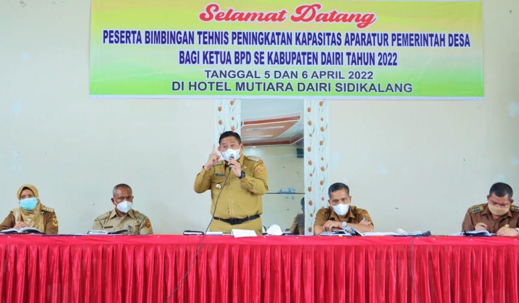 SIDIKALANG – LIPUTAN68.COM – 3 keputusan yang akan diambil Bupati Kabupaten Dairi saat melakukan dialog interaktif dalam Bimbingan Teknis (Bimtek) peningkatan aparatur pemerintah desa bagi ketua Badan Permusyawaratan Desa (BPD) se-kabupaten Dairi, yang diselenggarakan oleh Dinas Pemberdayaan Masyarakat dan Desa (Dispemdes) Selasa, 5-6 April 2022 bertempat di Hotel Mutiara Sidikalang. Bupati mengemukakan hal itu usai mendengar keluh kesah para ketua BPD se-Kabupaten Dairi siang itu.