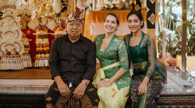 Bersama kedua orangtuanya, Laksmi Shari terlihat kembali mengenakan kebaya Bali dengan model yang lebih sederhana. Kebaya Bali kali ini berwarna hijau tua dengan bagian lengan yang transparan, dipadu kain bermotif sebagai bawahan, dan selendang hijau Army yang dililitkannya di pinggang. Foto: Instagram.