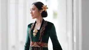 Laksmi Shari tampil bak putri raja dengan kebaya modern dari bahan beludru hijau, lengkap dengan aksesori bros emas dan belt di bagian pinggang, kain batik sebagai bawahan, dan rambut yang ditata sanggul, serta diberi hiasan bunga sebagai pemanis. Foto: Instagram.