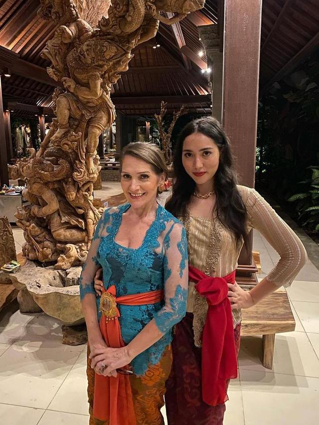 Berpose bersama sang ibu, Laksmi Shari terlihat mengenakan kebaya Bali bernuansa hijau muda, dipadu dengan kain bermotif bernuansa merah maroon, dan selendang merah yang dililitkannya di bagian pinggang. Foto: Instagram.