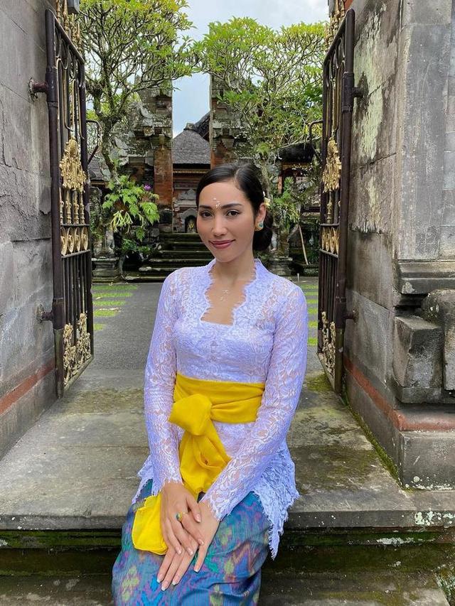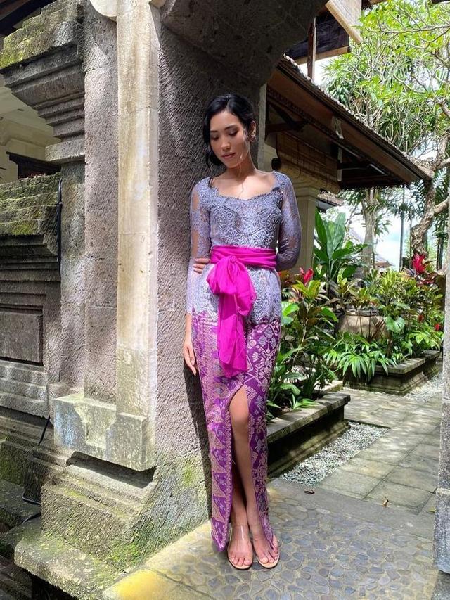 Laksmi Shari terlihat cantik dengan kebaya Bali berpayet berwawrna ungu kebiruan, dipadunya dnegan kain bermotif batik berwarna ungu dengan detail slit, dan selendang ungu muda yang diikatkannya di bagian pinggang. Foto: Instagram.