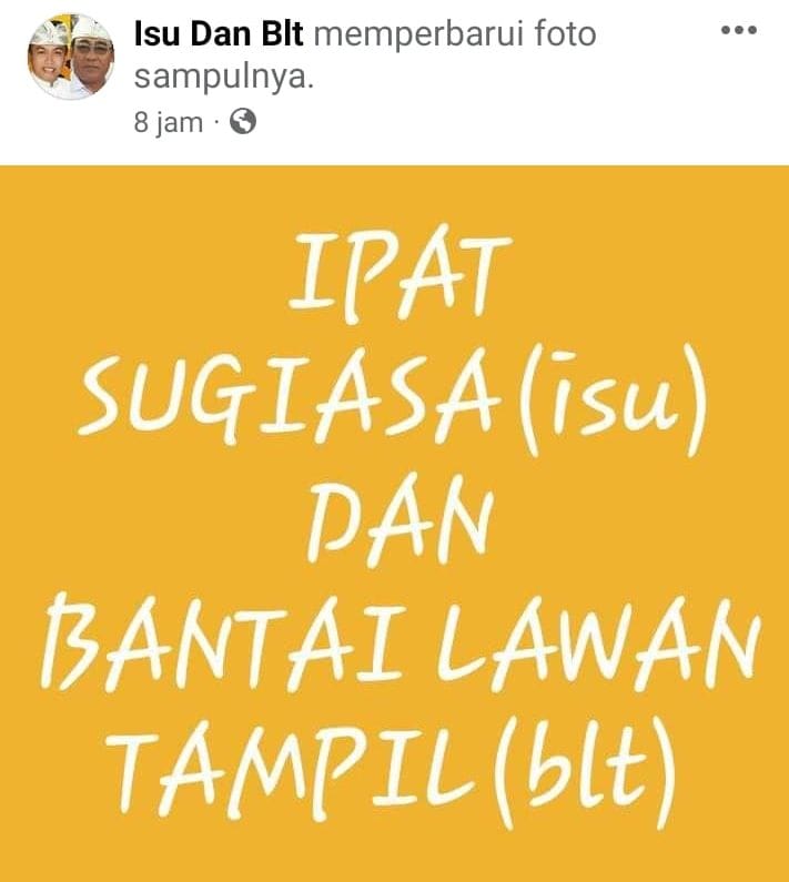 Entah siapa pemilik akunnya, yang jelas unggahan “ISU” (Ipat – Sugiasa) yang menyebutkan “BLT” (bantai Lawan Tampil) cukup membuat elit politik di Jembrana kelimpungan. Terutama dikubu pemegang tahta tertinggi dan barisan moncong putih.