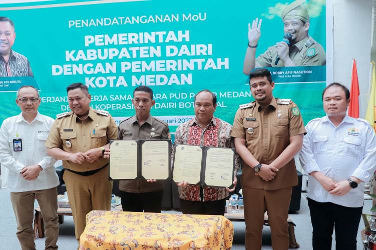 DAIRI – LIPUTAN68.COM – Pemerintah Kabupaten Dairi tandatangani MoU dengan Pemerintah Kota Medan dalam hal pertanian dan perdagangan untuk mengatasi inflasi dan kelangkaan bahan pangan. Tandatangan MoU tersebut dilakukan langsung oleh Bupati Dairi Dr. Eddy Keleng Ate Berutu dan Wali Kota Medan Muhammad Bobby Afif Nasution SE, MM, diikuti perjanjian kerja sama antara PUD Pasar Medan dengan Koperasi AUR Dairi Botanikal.
