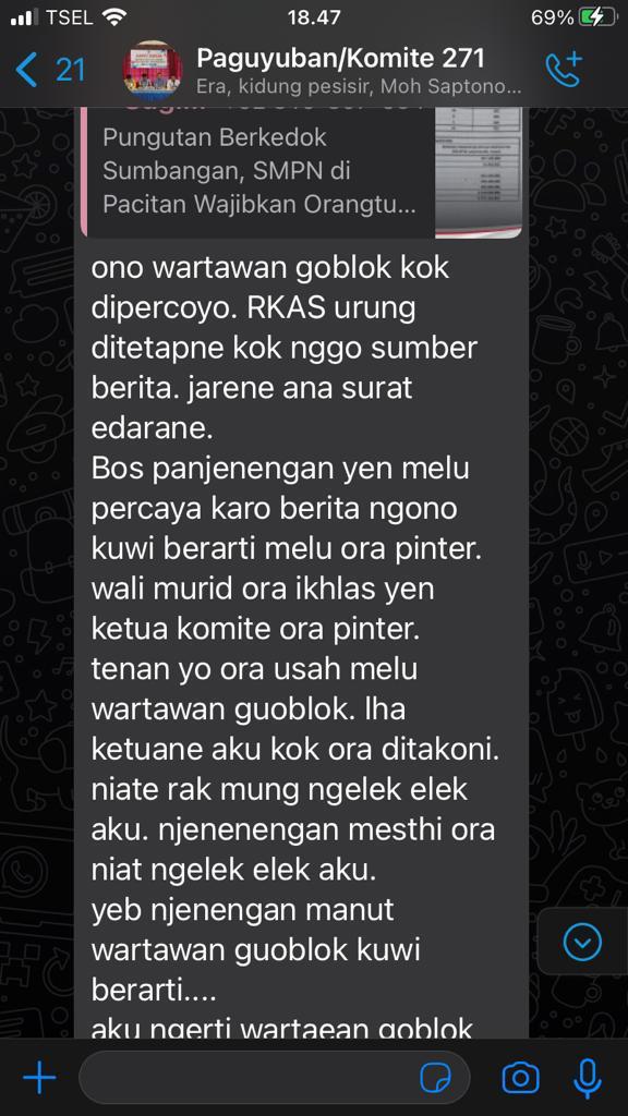 Pacitan – Pasca tulisan yang dilayangkan oleh mantan Ketua Komite Sekolah SMPN 1 Pacitan, yang menyebut wartawan ‘goblok’ di grup WhatsApp dan tersebar hingga di grup Forum Pewarta Pacitan (FPPA) beberapa hari lalu, kini eks komite itu minta maaf.