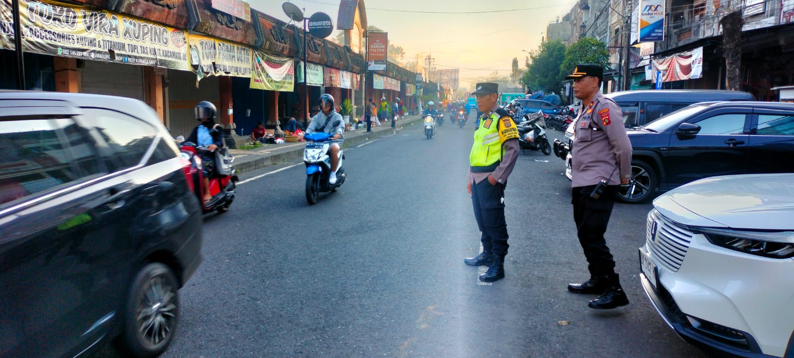 LIPUTAN68.COM TABANAN | Personel Polsek Kediri dipimpin langsung Waka Polsek Kediri AKP I Wayan Artha Yasa, S.Sos., melakukan pengamanan jalur di sepanjang jalan depan pertokoan Jalan Thamrin, depan Sekolah, dan SPBU wilayah Kediri Kabupaten Tabanan di pagi hari, Kamis, 16 Mei 2024.