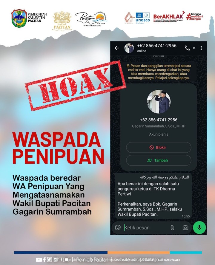 Pesan tersebut beredar dengan mengaku sebagai Wakil Bupati Pacitan dan menyasar sejumlah pengurus lembaga, termasuk institusi pendidikan. Pelaku menggunakan identitas lengkap beserta gelar akademik untuk meyakinkan calon korban.